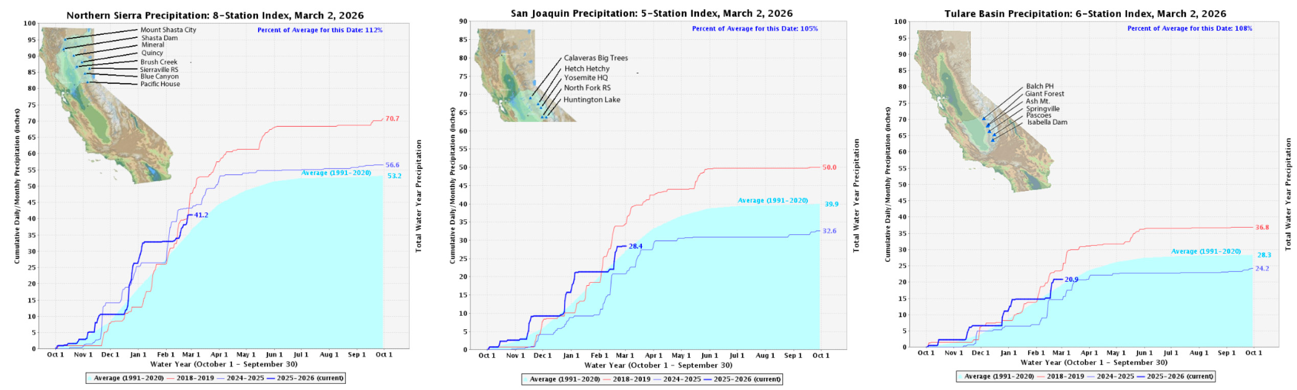 Following the late-February storms, Northern Sierra accumulations are currently tracking slightly below the analog envelope, while totals in the San Joaquin and Tulare basins remain squarely between the two analogs.
