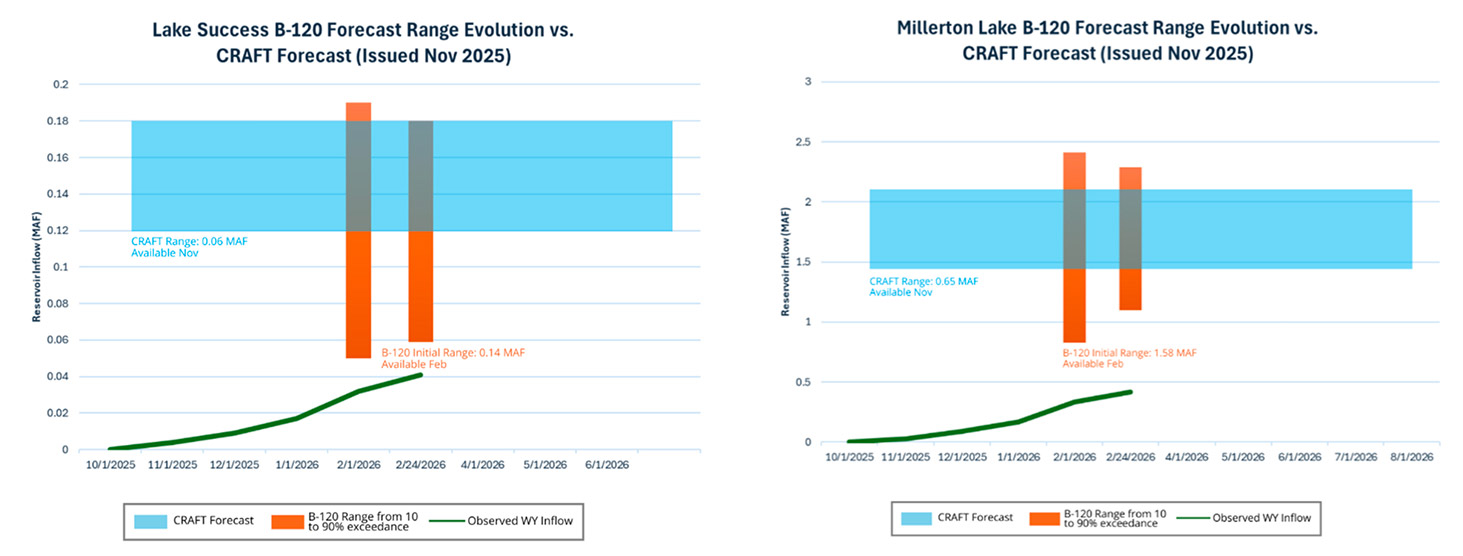 Starting in February, the Department of Water Resources provides the Bulletin 120 (B-120) forecasts, reflecting evolving hydrologic conditions based on observed precipitation and historic inflows. The B-120 offers a dynamic, regularly updated perspective as the season progresses, while CRAFT delivers a single, fixed-range inflow forecast issued each November—well ahead of the B-120’s initial February release.
